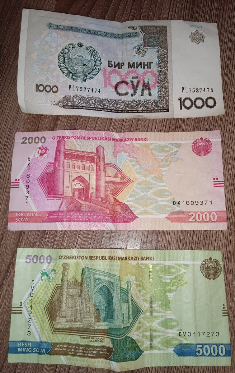 Спасибо уважаемым коллегам, за боны из Узбекистана. Вернувшиеся из командировки коллеги привезли, помимо позитивных новостей, еще и несколько презентов. По курсу на 15.11.2022 г. все три купюры суммой на 8 000 сум, это 43 рубля, то есть в денежной системе РФ сейчас эквивалентной купюры нет, только монеты. 1000 сумм 2001 года, банкнота первого года выпуска данной серии. Банкноты этой серии печатались в период с 2001 по 2019 год. Важный нюанс - до 2013 года на банкноте все надписи были на кириллице, с 2013 на латинице, мне досталась как раз первого типа. На обороте изображено здание государственной музей истории Тимуридов в Ташкенте. С июня 2021 года Центральный банк Республики Узбекистан вводит в обращение новые банкноты. Они печатаются на государственном предприятии «Давлат белгиси». По данным регулятора, представленные банкноты объединены между собой тематикой Великого шёлкового пути, проходившего когда-то также по территории современного Узбекистана. На всех банкнотах нанесены оче