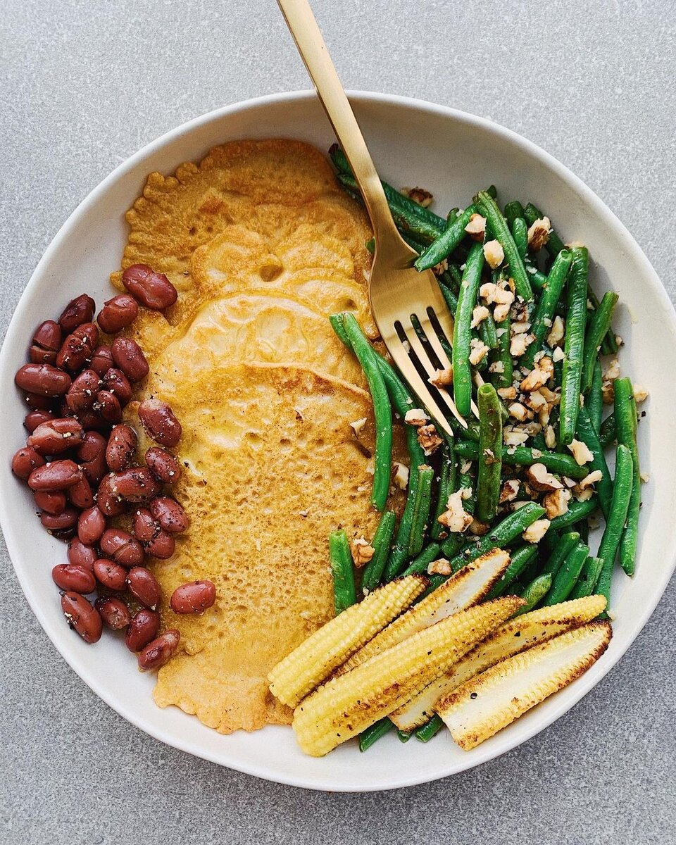 Два варианта питательного завтрака для него 👨🏻🍴: нутовые лепёшки с пармезаном и фасолью и быстрый омлет с бобами эдамаме 🥜💪🏼