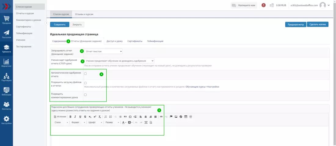 - при необходимости можно включить автоматическое одобрение отчета, разрешить загрузку файла и комментирование урока