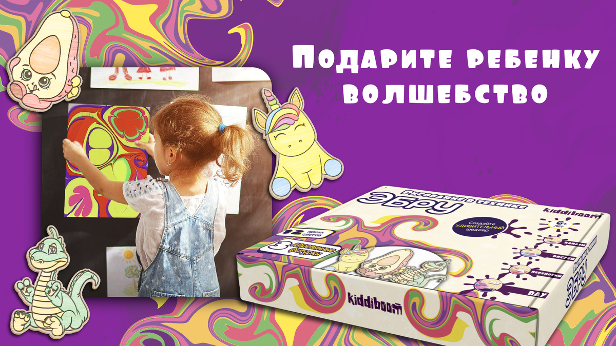 Творчество играет важную роль в гармоничном развитии ребёнка. Но, к сожалению, привычные краски, аппликации и лепка со временем надоедают. Развитие фантазии, мелкой моторики и пространственного мышления необходимо ребенку любого возраста. Тогда родители начинают искать то, что вновь вдохновит ребёнка на творческий процесс. Ваши дети когда-нибудь пробовали рисовать на воде? Искусство Эбру Kiddiboom – это удивительный метод создания мраморных узоров, в котором вода используется в качестве холста, затем готовую картину переносят на бумагу или деревянные фигурки. Это просто находка для сенсорного развития, которое способствует активному формированию нейронных связей. Процесс рисования на воде расслабляет и помогает ребенку избавиться от стресса и напряжения. Набор для творчества Эбру Kiddiboom станет отличным подарком для девочек и мальчиков дошкольного и школьного возраста. А для родителей это отличный повод провести время вместе со своими детьми.