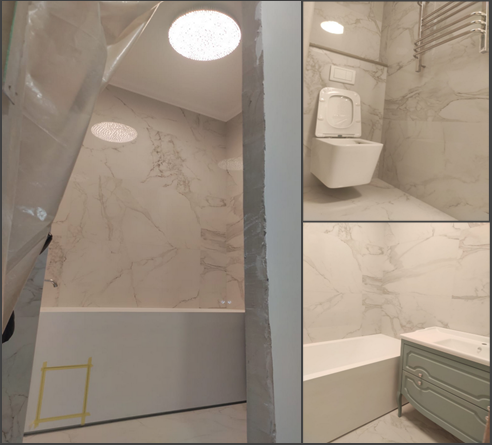 В предыдущих публикациях мы следили за ходом строительства небольшого магазина. И у наших читателей могло возникнуть впечатление, что строители всегда строят плохо, а потом другие строители исправляют косяки за счет заказчика. Но, к счастью, это не так. Вот, фотографии объекта, который находится в сложной стадии перехода от чернового этапа к чистовому. Начало - в мае 2022 г. Мы опустили черновой этап намеренно, но если вам все же интересно, можем опубликовать фотографии. Уже завезены многие финишные материалы (сантехприборы, светильники, кондиционеры и даже бытовая техника). Санузлы уже практически закончены: в ванной комнате уложен кафель, установлена сантехника и даже светильник, потолки и лепка открашены. Дверей еще, конечно, нет, но вход тщательно закрыт пленкой. В душевой тоже уложен кафель, потолки и лепка готовы, но поскольку этот санузел используется для производства работ, сантехника стоит не вся (раковина и унитаз временный), все необходимое укрыто, полы и наружный угол защ