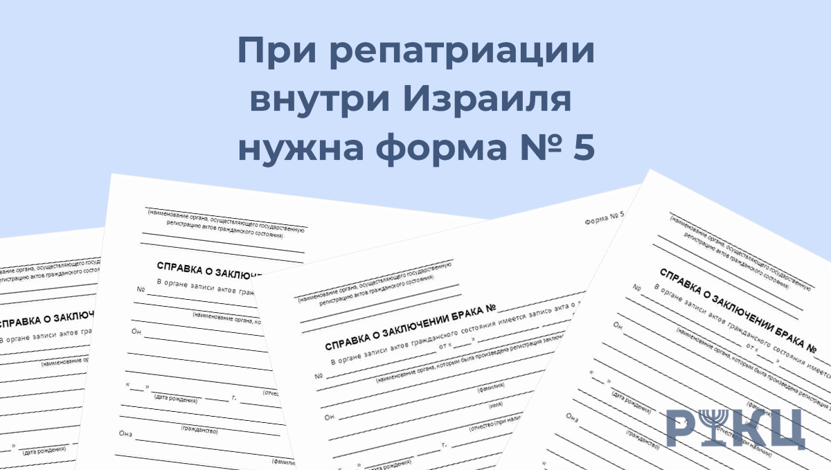 В министерствах и ведомствах стали требовать форму №5 при репатриации внутри Израиля. Без нее теперь нельзя получить Теудат-зеут. Раньше пятую форму просили только в Хайфе, но в последнее время — еще и в Тель-Авиве, и в Нетании. Скорее всего, в ближайшие дни ее начнут требовать по всей стране. 👉🏻 Форма №5 — это справка о том, что брак действителен на текущий момент. Справку о заключении брака можно получить через МФЦ или госуслуги. Она действительна в течение 3 месяцев. #репатриация #израиль #документы