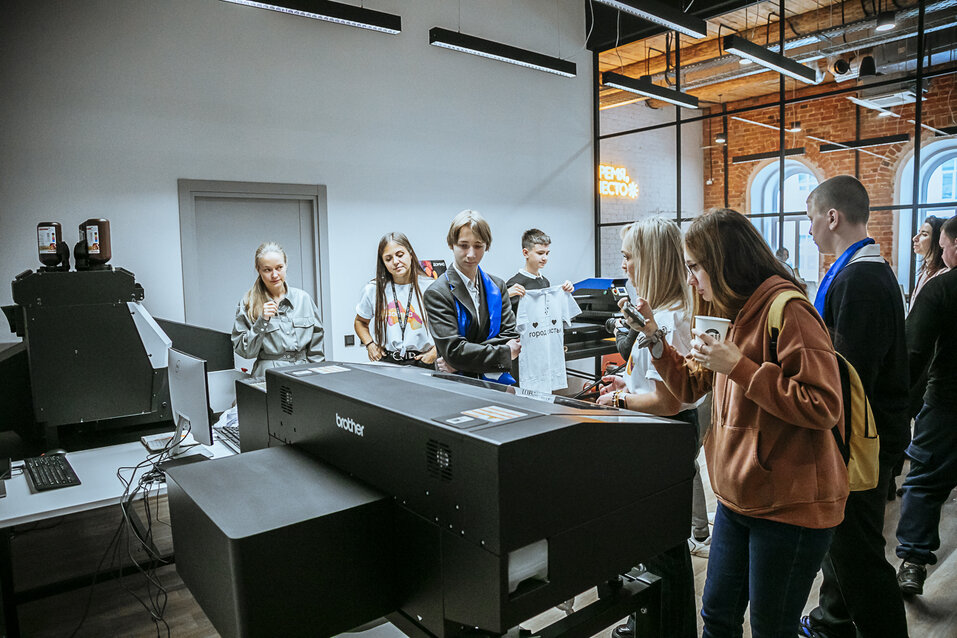В Екатеринбурге прошел первый современный урок технологии для учеников гимназии №13, в котором приняли участие мэр Алексей Орлов и директор Свердловского областного фонда поддержки предпринимательства (СОФПП) Валерий Пиличев. Дети работали в помещении интеллектуального кластера «Домна», оснащенного современным оборудованием для изготовления мерча на разной продукции. Детям прочитали лекцию об истории дизайна и затем выдали ноутбуки, на которых каждый ученик мог сконструировать собственный проект рисунка футболки «на тематику 300-летия Екатеринбурга», затем при поддержке технолога напечатать изображение — и готовый продукт в единственном экземпляре унести домой. «Для нанесения изображения на белых футболках мы используем принтер прямой печати. Дополнительная обработка материала не нужна, мы сразу размещаем ткань на столе. Принтеры японские, у них очень качественная печать — мы это гарантируем. После этого футболку помещаем в термопресс: изображение фиксируется при температуре 180 градус