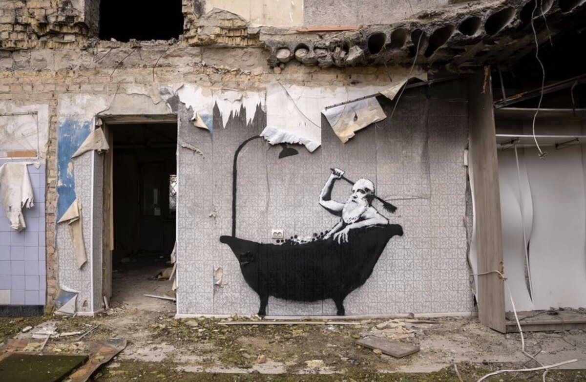 Изначально художник выложил в соцсетях свой рисунок, нарисованный на стене разрушенного здания в Бородянке. Теперь же подтвердил изданию The Art Newspaper, что в общей сложности выполнил семь новых работ в Украине. При этом граффити появились в разных городах страны, включая Киев. Среди работ Бэнкси — женщина в халате и бигуди, которая стоит в противогазе и с огнетушителем в руках; мужчина, которого бросает во время поединка (вероятно, по дзюдо) маленький мальчик; бородатый мужчина, который принимает ванну на фоне развалин.