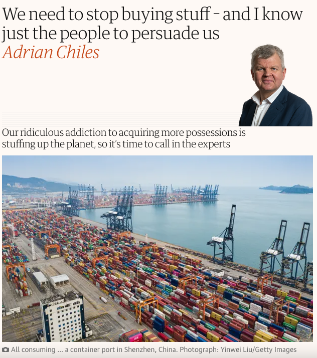 Adrian Chiles opens his article with an anecdote-like story about his friend, an avid supporter of green theories, who went to an expert in woodland conservation to get advice on what type of wood he should build a new kitchen with but received just a backhander. The suggestion was: ‘Ask yourself if you really need a new kitchen’. The broadcaster laments a fact that ‘point taken, but not much acted upon’. The article seems to express the honest author’s disgust towards his own inability to stop buying useless stuff, having already stored a good 70% of it, including books, clothes, and kitchen utensils that previously were deemed felt important. He makes a sarcastic statement that he will not take anything to his grave. So what’s the point of buying more and more? To do harm to the environment? Even leaving the stuff to his children won’t do any good to them for the stuff otiosity.