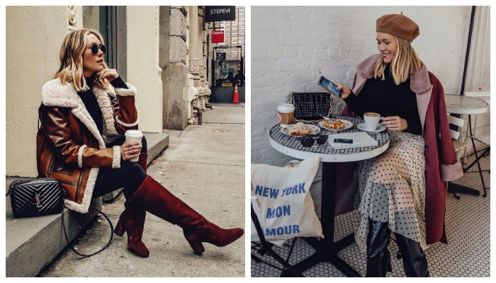 Чтобы пробудить желание создавать необычные и стильные аутфиты, несмотря на непогоду за окном, мы сделали колоритную подборку образов, в которых будет комфортно и модно. Начнем с красивого и практичного образа, который сочетает в себе трендовую модель дубленки оверсайз размера с контрастным светлым мехом, черную минималистичную водолазку, темно-серые скинни джинсы, а также высокие замшевые сапоги благородного карамельного цвета. Завершающим элементом данной комбинации вещей стал стеганый черный клатч с золотой фурнитурой. Бежевая укороченная дубленка с белым мехом + белоснежная шапка бини + трикотажная водолазка + укороченные светло-голубые джинсы скинни + громоздкие ботинки на шнуровке — комфортный образ на каждый день. Трендовую шубу Тедди песочного цвета стилисты дополнили белоснежной шапкой с меховым помпоном, вязаным свитером, базовыми джинсами и классическими кожаными ботильонами на небольшом каблуке. Для следующего эффектного образа стилистам понадобилось пальто в хищный принт,