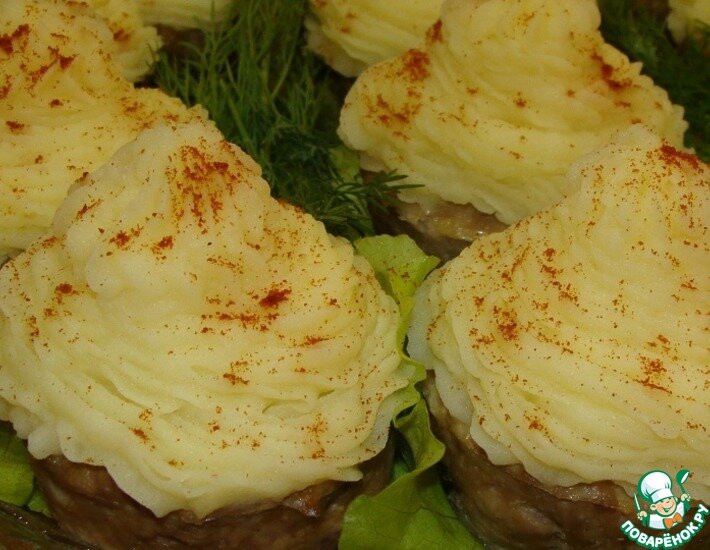 Рецепт мясных кексов, или капкейков, или маффинов. Называйте, как хотите. Предлагаю вариант красивого оформления блюда из простых продуктов. Можно подавать как на горячее, так и на закуску. Ингредиенты для «Мясные капкейки с начинкой»: Фарш Начинка Кроме того Время приготовления: 50 минут Количество порций: 12 Рецепт «Мясные капкейки с начинкой»: Сварить картофель и сделать пюре с добавлением сливочного масла, молока и соли. Панировочные сухари или хлеб залить молоком, перемешать и оставить набухать. Грибы мелко нарезать, сыр потереть на терке. Положить в блендер лук, замоченные сухари, яйца, измельчить. Добавить полученную массу к фаршу, посолить, положить специи и хорошо перемешать. Формочки для кексов смазать маслом. Выложить немного фарша, пальцами сделать углубление, формируя стенки. Положить грибы, сыр. Сделать руками лепешку из фарша и положить сверху, прижать. Запекать при 180-190 град. в разогретой духовке около 30 мин. Картофельное пюре переложить в кулинарный мешочек и выдав