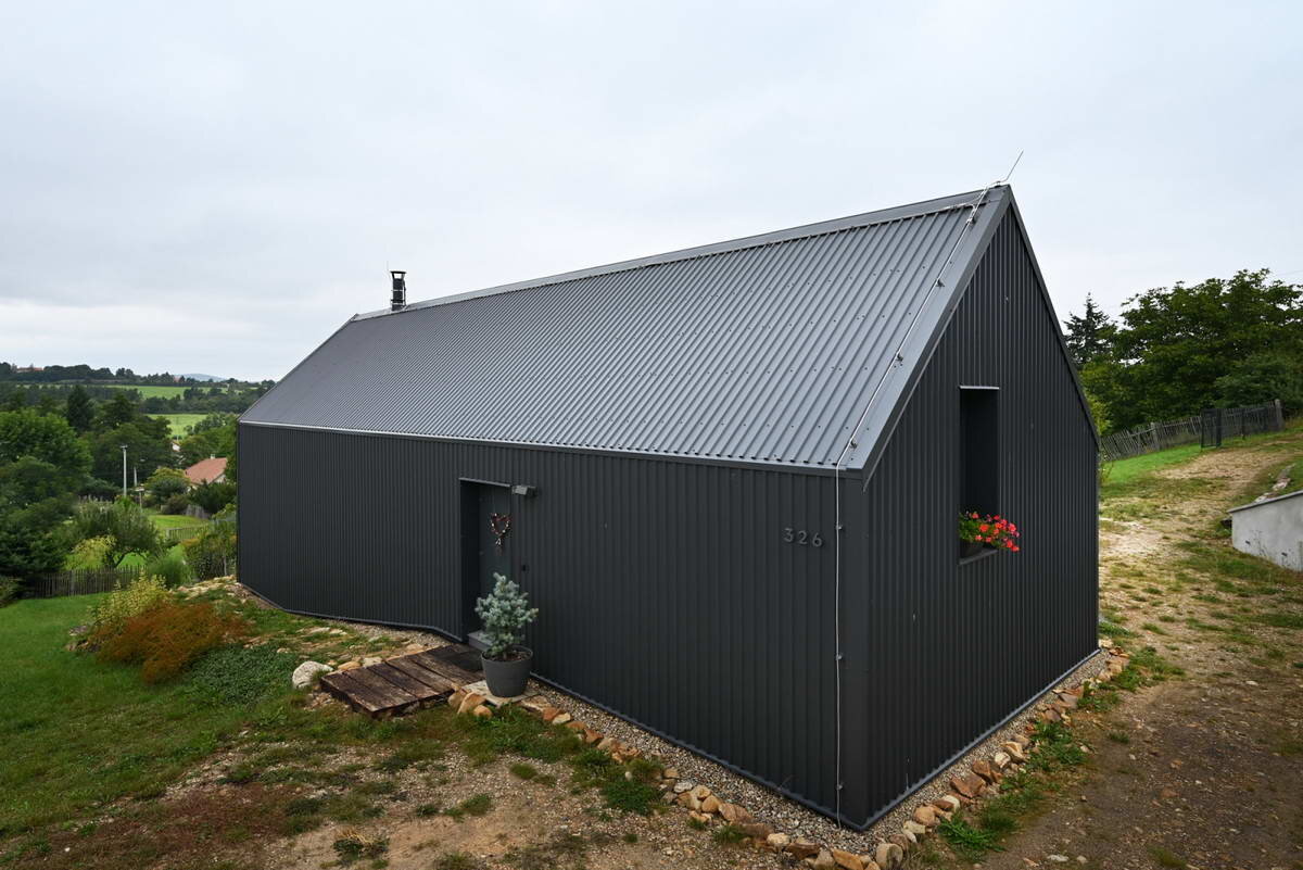 Дом выходного дня на окраине деревни в районе Бероун в виде форменного архетипа, окутанного мантией из листового металла антрацитового цвета. Вместо желобов и канализации вода стекает с крыши по фасаду на землю, где просачивается в почву, как если бы она просачивалась без присутствия здания. Длинный входной фасад, обращенный к соседям, полностью лишён окон из-за интимности. На фронтоне с другой стороны доминирует большое окно с освежающим далеким видом на деревню и сельскую местность. Дом не разделён на комнаты классически, а наоборот, взаимосвязанное пространство течёт медленно и плавно переходит из одной «комнаты» в другую. Это удовлетворило желание семьи чувствовать, что они приятно проводят время вместе и в то же время у каждого есть своя личная жизнь. Интерьер расположен на разных уровнях высоты, которые копируют открытый ландшафт. В оболочку из листового металла вставлена древесная масса, которая выполняет несущую, разделительную, эстетическую, тактильную и приятно ароматическую