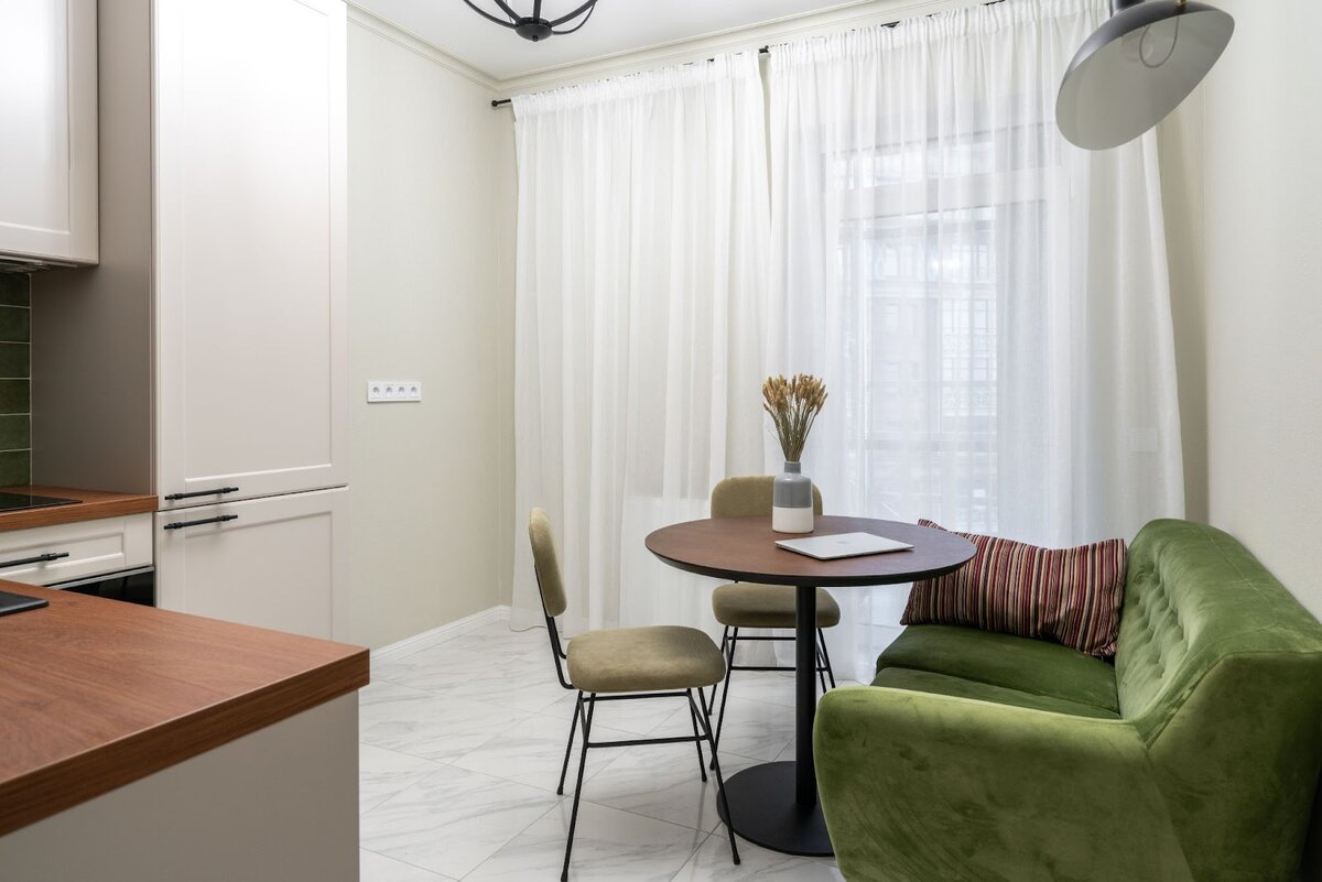 Зеленым акцентом в этой части квартиры является бархатистый диван и испанская глазурованная плитка на фартуке. Металлические детали в интерьере выполнены в черном цвете: карниз для штор, бра, люстра, мебельные ручки, основание у стульев и стола.