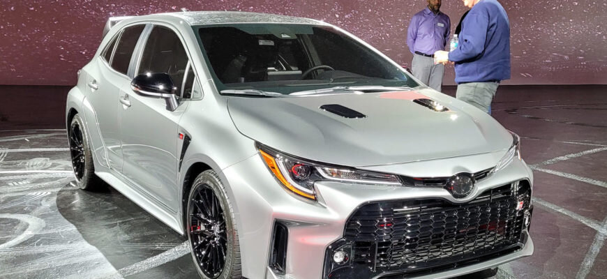 В Калифорнии, США, состоялась презентация «заряженной» Toyota GR Corolla 2023 модельного года. Модель будет продаваться только в США. Обзор. Новинка создана на базе пятидверной Corolla в североамериканской спецификации. Внешне же автомобиль отличается более массивными и сложными бамперам, крупным спойлером на крыше, выпускной системой с тремя патрубками, расширенными крыльями и черными 18-дюймовыми колесными дискам, «обуты Салон. В салоне установлена цифровая приборная панель диагональю 12,3 дюйма, разработанная специально для моделей GR, и механический «ручник». Технические характеристики. Toyota GR Corolla 2023 Новинка оснащается 1,6-литровым мотором G16E-GTS, который форсировали с 272 до 300 лошадиных сил. Максимальная мощность достигается при 6500 оборотах в минуту. Предельный крутящий момент по-прежнему составляет 370 Нм – как у JDM-версии «Яриса» (у европейского – на 10 Нм меньше), он доступен в диапазоне от 3000 до 5500 оборотов в минуту. Силовой агрегат работает вместе с 6-ступ