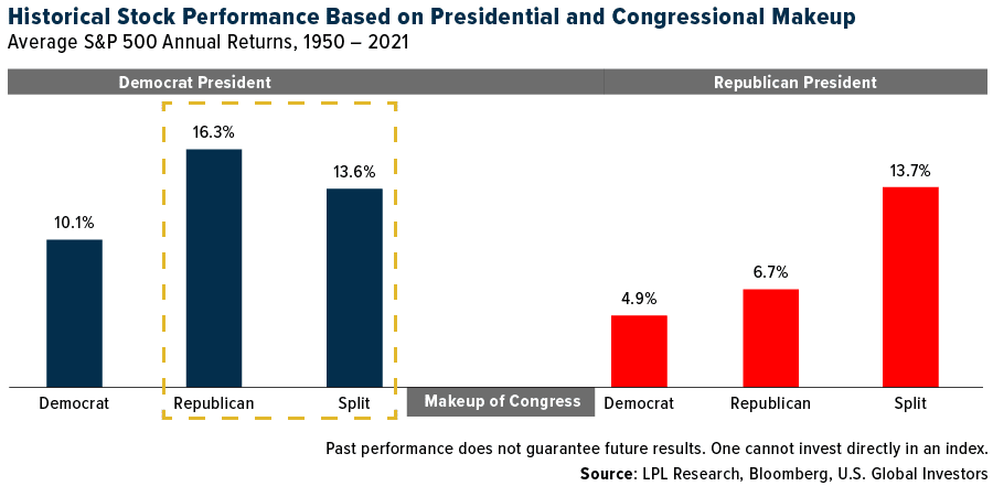 Недавно назначенный босс Твиттера Илон Маск подвергся критике перед выборами за то, что рекомендовал людям голосовать за республиканцев в Конгрессе, написав, что "совместная власть сдерживает худшие эксцессы обеих партий". Нравится это нам или нет, но Илон прав. По данным LPL Research, с 1950г S&P 500 приносил самую высокую среднюю доходность, когда Белый дом находился в руках демократов, а Конгресс — республиканцев. Доходности также были выше среднего, когда Конгресс был расколот, независимо от того, какая партия занимала Овальный кабинет.