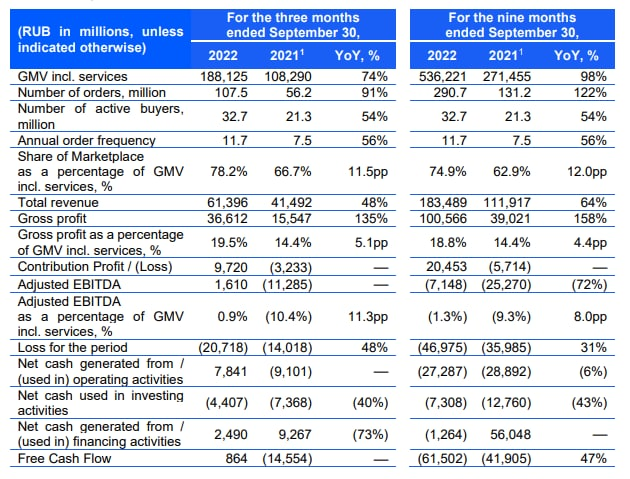 ✅ GMV (продажи в Маркетплейсе) вкл. услуги выросли на 74% г/г до 188,1 млрд рублей в 3 квартале 2022 года ✅ Выручка +48% г/г и составила 61,4 млрд рублей ✅ Значительно увеличилась валовая прибыль , увеличившись на 135% год-к-году до 36,6 млрд руб. ✅ Ozon достиг положительной скорректированной EBITDA в размере 1,6 млрд рублей в 3 квартале 2022 года по сравнению с отрицательной 11,3 млрд рублей в 3 квартале 2021 года, 🚨 Убыток за период составил 20,7 млрд руб. в 3 кв. 2022 г. по сравнению с 14,0 млрд руб. в 3 кв. 2021 г. в связи с разовым увеличением операционных расходов на 10,8 млрд руб. в результате вышеупомянутого пожара . ✅ Чистые денежные средства, полученные от операционной деятельности , увеличились до 7,8 млрд руб ✅ Свободный денежный поток был положительным и составил 0,9 млрд руб. в 3 кв. 2022 г. по сравнению с отрицательным значением 14,6 млрд руб. год назад ✅ Денежные средства, их эквиваленты и краткосрочные депозиты составили 65,6 млрд рублей Эх, ну ч