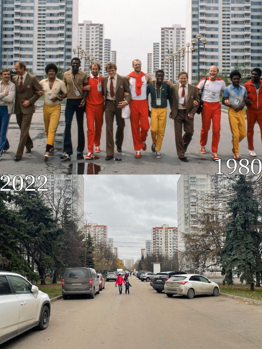Олимпиада 1980 года в Москве стало эпохальным событием. Это была первая олимпиада, которая проводилась в Восточной Европе, да еще и впервые её принимало социалистическое государство. Правда без политики не обошлось: из-за ввода советских войск в Афганистан многие страны бойкотировали соревнование. Но речь пойдет не об этом, а об Олимпийской деревне в Москве. История строительства деревни очень необычная. Я приехал в нее и сделал снимки было/стало в формате 1980 год и 2022. 1) Спортсмены из СССР, Германии и Гайаны Если вы не особо изучали вопрос строительства Олимпийской деревни, то у вас наверняка вопрос! Почему это простой спальный район? Долгое время власти не знали, где разместить спортсменов и как затем использовать построенные здания. Тогда было принято решение – построить целый спальный квартал со всей инфраструктурой, а после олимпиады отдать его простым москвичам! 2) Площадь наций Так, к примеру, выглядела площадь наций. Необычно видеть простой район Москвы в таком виде! Всего