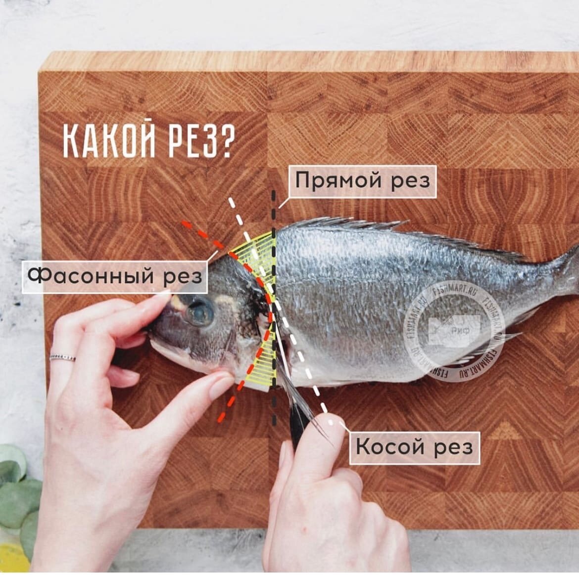 Декапитация или отрезание рыбной головы. Знали такое слово? Вот теперь знайте😄 В процессе разделки рыбы нередко нам приходится прибегать к отрезанию ее головы, особенно, если тушка большая и разные ее части вы планируете использовать в разных блюдах. Существует несколько видов разделки: прямой, косой, клинообразный и фасонный (фигурный) рез головы. 🔪При прямом резе его плоскость перпендикулярна к оси тела рыбы, 🔪при косом расположена под определенным углом. 🔪При клинообразном резе имеются две плоскости обработки, расположенные под углом друг к другу и к оси тела рыбы. 🔪При фасонном (фигурном) резе плоскость обработки повторяет очертания жаберных крышек. Если непонятно, смотрите схему↗ 👉🏻Если вы планируете сварить из голов бульон и что-нибудь из них пощипать на суп, целесообразнее выбирать прямой или косой рез (при прямом в голове остаётся больше мяса, чем в косом) 👉🏻Если рыбья голова - это отход, от которого вы избавитесь, логичным будет применение клинообразного