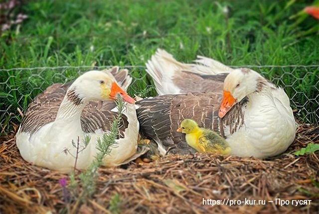 Оптимально использовать в качестве наседки являются гусыни «в возрасте», которые прекрасно плавают и ныряют. Такие самки будут заботиться о потомстве в течение 30 суток, научат их плавать, защитят от сквозняков и посторонних глаз. Иногда в помощь наседке подсаживают самца, который будет помогать ей ухаживать за молодняком.