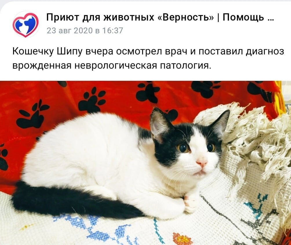 Кошка Шипа прожила в приюте два долгих года в ожидании хозяев. У Шипы серьезная неврологическая проблема- нарушение координации и к сожалению врожденная. И поэтому малышке так долго пришлось ждать не смотря на свой замурчательный характер. Но и на ее улице настал праздник. Шипу забрали домой!!! Но кроме прекрасной и радостной новости есть, конечно же чему расстраиваться и за кого переживать. Очередной пострадавший, пока характер и происхождение травм неизвестно, а может быть это какое либо заболевание. У собаки обездвижены задние лапы, он не может встать. Все прояснит осмотр и обследование. Группа приюта