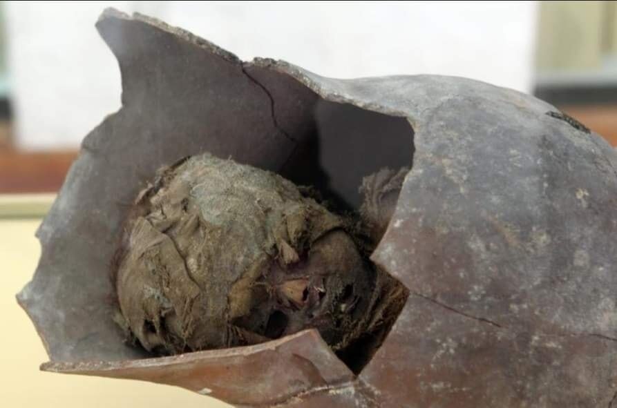 Перу, культура Кахамарка 1-15 века нашей эры. Мумия детская ,завернутая в текстильное полотно. Видна часть лица, мягкие ткани: кожа, два зуба: резцы на верхней челюсти, а также пучки светло-каштановых волос. Похоронный сверток находится внутри урны, которая в данном случае представляет собой коричневый керамический сосуд перевернутой конической формы с расходящимися прямыми сторонами. На поверхности сосуда наблюдаются темные пятна. Источник: Министерство культуры Перу, Монументальный комплекс Белен.
