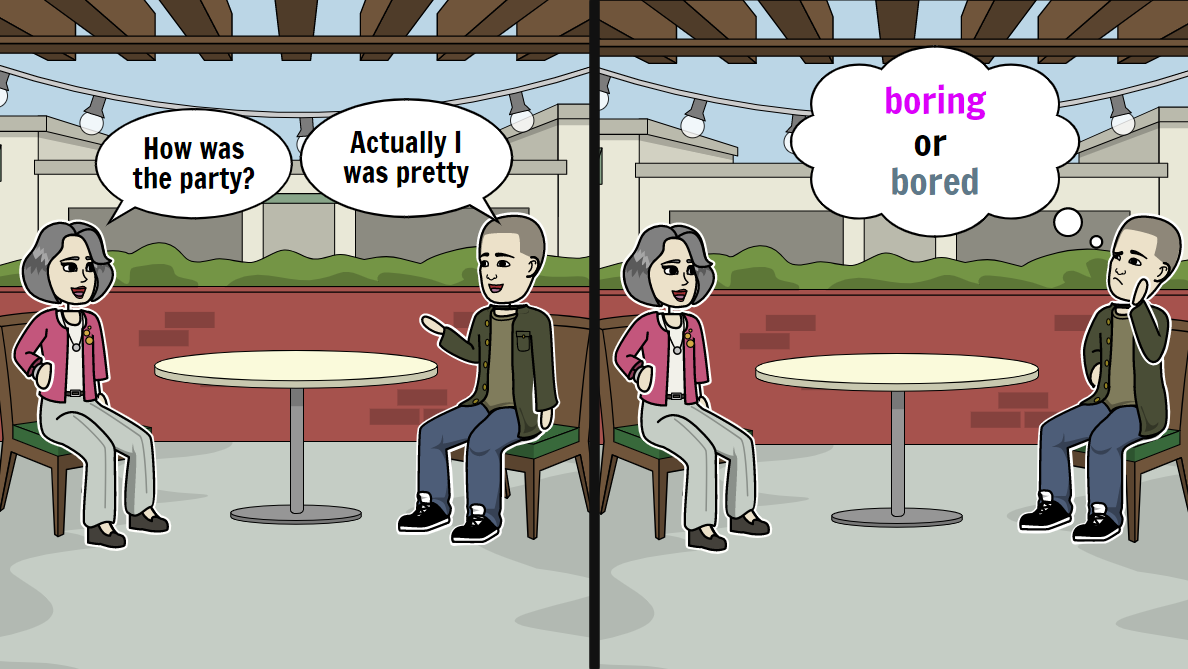 Сегодня рассмотрим один грамматический момент, который в своё время меня озадачивал. Это использование прилагательных, оканчивающихся –ed и –ing, таких как bored и boring или tired и tiring. Сначала посмотрим на этот разговор между двумя друзьями. — Hey Jenny, how’s it going? — Hey Bob pretty good. So what’s up? — Well I went to Jack’s party last night. — Wow. How was the party? — Actually I was pretty boring. Jenny was surprised with bob’s answer. Как думаете, с этим примером всё хорошо? А что насчёт следующего? My friend Lori has been working at the same company for more than 20 years. Everyday has become the same. She does the same task each day over and over and over again. Her job is very routine. Her job is boring. Заметили, что в обоих примерах использовалось одно и то же прилагательное? А теперь давайте разбираться в каком из них допущена ошибка. Слова, оканчивающиеся на –ed, описывают, что человек чувствует по отношению к чему-то. К таким словам относятся: bored, excited, int