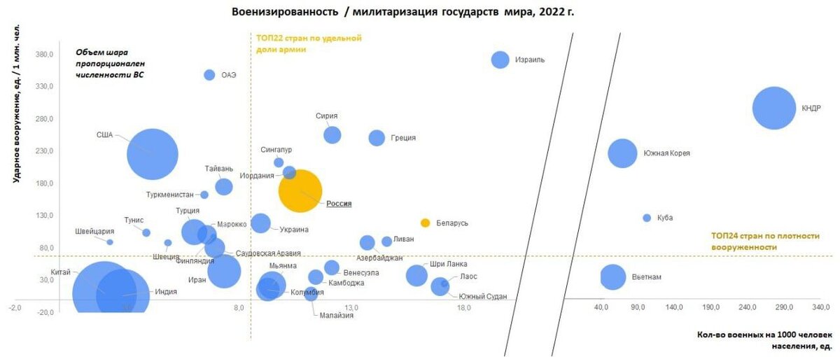 #геостратегия Уровень общей турбулентности в мире нарастает, что становится очевидно многим, мировая катастрофа всё ближе. За последние тридцать лет, из-за монополии США на вооруженные действия в мире, стало привычно, что ключевым фактором для определения значимости и веса страны является экономическая мощь, что упростилась в понимании многих до бухгалтерского по сути показателя ВВП. В ближайшие 7-10 лет важнейшим, критическим ресурсом станет безопасность, способность себя защитить, взять под защиту / контроль соседние страны и территории. Существует несколько популярных и общепризнанных рейтингов армий, основанных на расчете необходимой численности, вооружения и/или размере военного бюджета. Каждая методика имеет свои ограничения, но есть и общие – не учитывается боевой дух, реальный опыт, боеспособность, наличие и состояние собственного ВПК и т.д., помимо абсолютных значений нужно рассматривать и относительные. Высокий уровень военизированности / милитаризации общества четко демонст