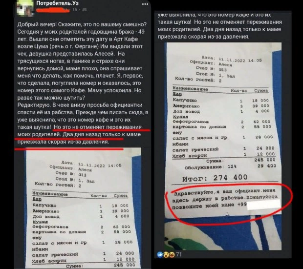 В социальных сетях распространился чек-счет заведения общественного питания в Фергане. В чек-счете за заказанные блюда внизу написаны следующие слова: "Здравствуйте, я ваш официант, меня здесь держат в рабстве, пожалуйста позвоните моей маме". К этим словам также прикреплен номер телефона. Дочь одной из клиенток заведения сообщила о том, что ее родители посетили ресторан, чтобы отметить 49-летие брака. По словам женщины, ее родители вернулись в панике домой и сообщили дочери о том, что написано в чек-листе. Мать женщины сильно переживала и просила ее помочь девушке-официантке. Когда женщина начала искать номер в Google-поиске, она увидела, что этот номер принадлежит самому ресторану. В результате, мать женщины переживала и испытала стресс. За несколько дней до этого, к ней приезжала скорая из-за повышенного артериального давления. Гражданка считает, что подобные шутки неуместны, ведь есть люди, которые воспринимают их в серьез и переживают за официантов, якобы находящихся в рабстве.