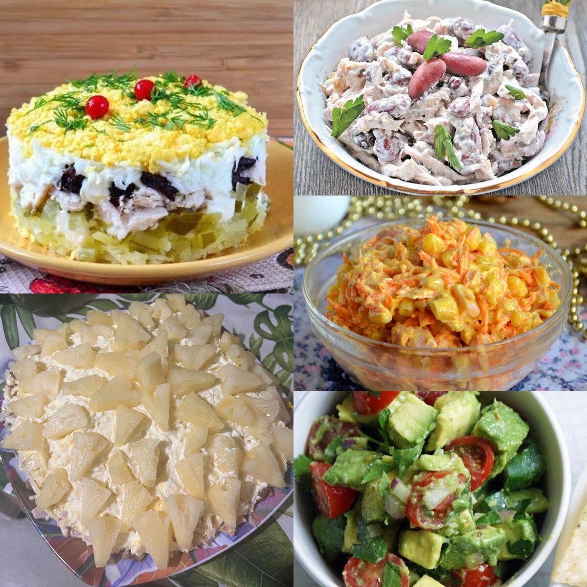 Приветствую всех на своей странице! Хочу поделиться с вами самыми простыми, но в то же время не надоедливыми салатами. Их можно готовить как на семейный ужин, так и на праздничны стол! Думаю, гости оценят ваши кулинарные способности. Понравятся рецепты: ставьте лайки, комментируйте и подписывайтесь, дальше будет вкуснее и интереснее. 1 салат с курой и черносливом. Ингредиенты: Ингредиенты указаны в порядке слоев. Куру разделить на волокна, чернослив и огурец порезать тонкой соломкой, белок натереть на средней терке, желток на мелкой. Сверху покрошить грецким орехом (его нужно мелко раздробить). Этот салат мне нравится больше, чем оливье. 2 салат с авокадо и киви (знаете, как в рекламе, порадуй свои вкусовые сосочки))) Даже не знаю как он называется! Первый раз попробовала у подруги, поразило сочетание киви и авокадо. Сначала подумала, что за сумасшедший придумал такой рецепт, а потом не могла оторваться! Ингредиенты: Авокадо и киви почистить и порезать брусочками. Черри пополам. Чесн
