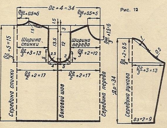 Выкройка (рис. 12 в начале статьи) построена по следующим меркам (мерки окружностей даны в половинном размере в см):