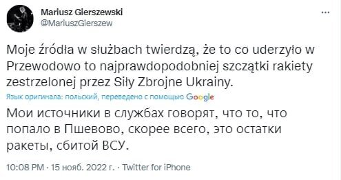Это были украинские ракеты ЗРК С-300, но признают ли этот факт в США? Пока Вашингтон не торопится вступать с Москвой в прямое столкновение – считают эксперты FederalCity. Вечером 15 ноября польские СМИ сообщили, что якобы "две российские ракеты попали в зерносушилки и трактор в деревне на востоке Польши, расположенной на границе с Украиной, погибли два человека". Впрочем, первоисточник новости о попадании ракеты на территорию Польшы, журналист из радио "Zet" Мариуш Гершевски, сразу сообщил, что во взрыве в Пшеводуве виновата украинская ракета. Как и следовало ожидать, в западных и украинских СМИ поднялся шум, обвинения в адрес Москвы посыпались градом, а обнаруженные рядом с местом взрыва обломки определили, как ракеты российского производства. Однако специалисты вносят коррективы – эти "доказательства" имеют советское происхождение и состоят на вооружение ВСУ. Первый пост об инциденте в Люблинском воеводстве. "Судя по представленным поляками обломкам и последствиям падения ракеты, это