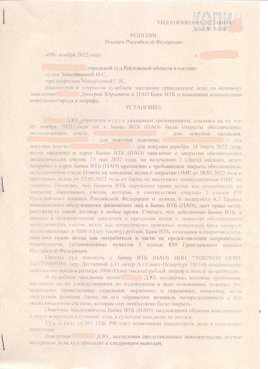 И снова Банк ВТБ в центре внимания, так как не может существовать без того, чтобы не нарушить права потребителя, в очередной раз не предоставив преимущество потребителю при закрытии счетов. В этой истории, я вам расскажу о том, что автором в 2021 году были открыты в Банке ВТБ обезличенные металлические счета (ОМС) для покупки золота, серебра, платины и палладия. Когда у автора статьи отпала надобность в использовании вышеуказанных счетов, он обратился в отделение банка по вопросу закрытия ОМС, специалист Банка ВТБ помочь клиенту не смог и рекомендовал обратиться в другое отделение Банка ВТБ. Автор статьи, обратившись в другое отделение Банка ВТБ, так же столкнулся с тем, что специалист банка не смог произвести закрытие ОМС сославшись на банковскую систему, которая не позволила ему произвести закрытие ОМС и порекомендовал отправиться в город Герой Москва для закрытия вышеуказанных счетов. Таким образом "Банк ВТБ отказав в закрытии ОМС, заявил клиенту о том, что закрывать любые счета