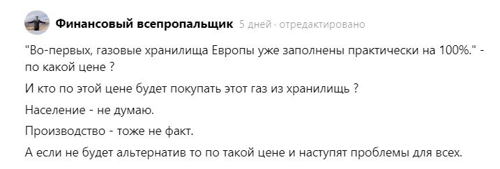 в комментариях появилось немалое количество жаждущих доказать, что там все ужасно не потому, что газа не хватает (так как его все же вполне достаточно, с цифрами не поспоришь), а потому, что он стал неподъемно дорогим. "В десятки раз подорожал", - пишут комментаторы. Подобных комментариев оставлено очень много, большинство из них с аккаунтов, которые я вижу впервые, и наверное больше не увижу, но есть и от постоянных читателей. Приведу один в качестве примера, а так можете сами почитать.