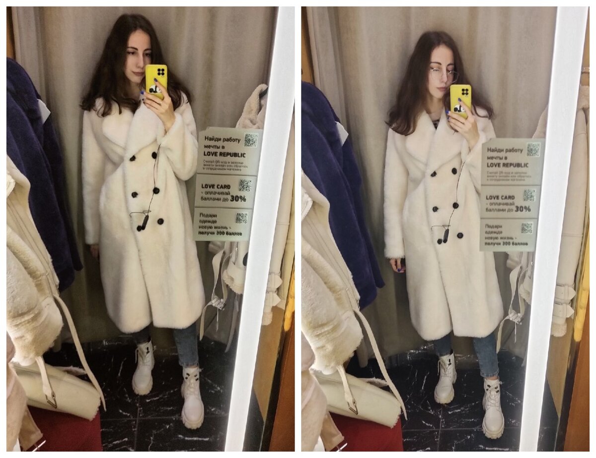 Всем привет и добро пожаловать на мой канал. И сегодня завершаю серию статей про верхнюю одежду в различных магазинах, на этот раз это будет Love Republic. Первый вариант - это белая шуба. Состав полиэстер и шерсть. Шуба не слишком мягкая, а такая модель чебурашка. Выглядит очень круто, я в восторге от модели, она объемная, при этом выглядит аккуратно. Оттенок чисто белый, хоть на фото кажется и каким-то бежевым. Здесь у меня размер М, цена 24999 рублей. Вторая шуба более забавная, в фиолетовом оттенке. Конечно, выглядит уже более дешево, напоминает материал, как у детских игрушек. Довольно короткая, но длина оптимальная для зимы. Размер на мне S, цена 7999 рублей. Дальше покажу дубленки: Первая - это черная дубленка с белой отделкой. Мне модель совершенно не понравилась, меня совсем не красит, хотя, конечно. у всех свой вкус. Просто такие модели совсем не мое, материал грубый, очень неуютно мне в ней было. Размер на мне M, цена 9999 рублей. Вторая дубленка уже намного лучше, у