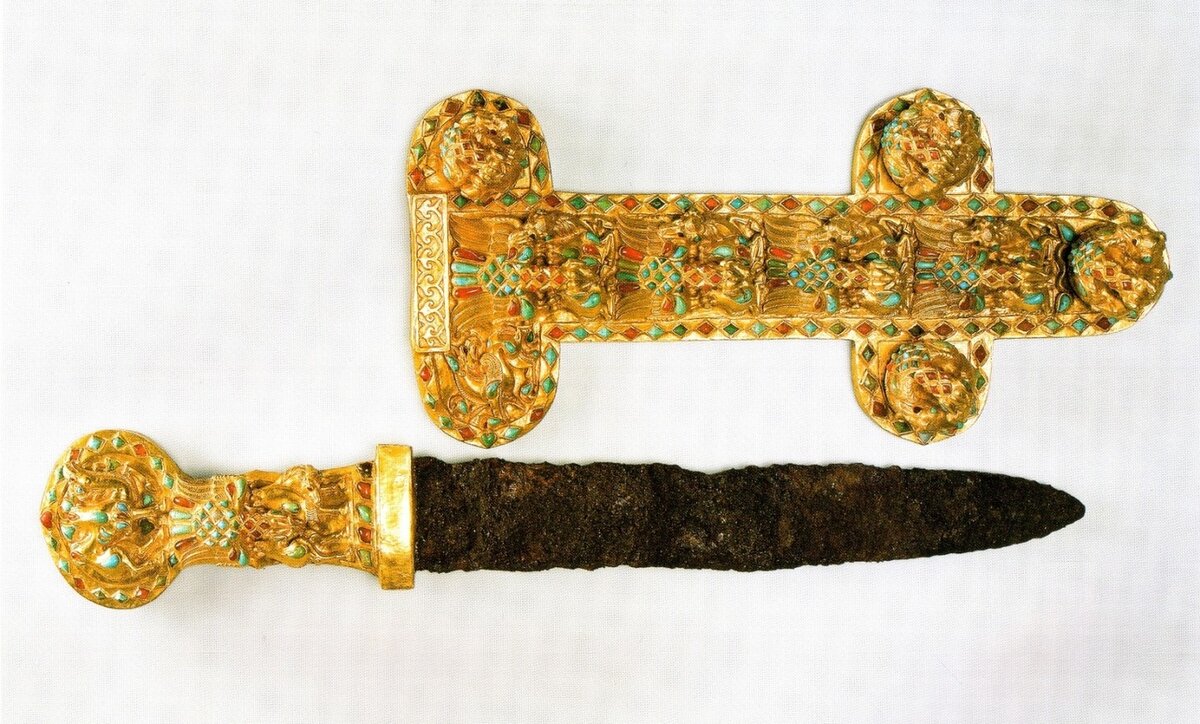 Клинок у гуннов и аланов также не мог оставаться без хозяина, так как между ним и хозяином (хозяйкой) существовала прочная мистическая связь. Без своего клинка усопший не мог безопасно переходить в потусторонний мир. Поэтому клинку придавали такое большое ритуальное значение. Но в катакомбе амазонки лежал ещё и нож, тоже с золотой рукояткой и в золотых ножнах, что также, вероятно, имело глубокий смысл. Рядом с этим великолепным оружием был найден женский косметический набор амазонки. Мы уже писали в одной из наших статей о том, что у кочевников Евразии клинок мыслился как единое целое со своим хозяином и обладал тоже душой. Поэтому клинки часто сгибали или скручивали и клали вместе с погибшим хозяином.