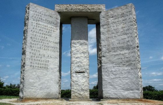 На каменистом холме на северо-востоке североамериканской Джорджии находится один из самых странных монументов, созданных в наше время. Известен он под названием “Georgia Guidestones”, или “Скрижали Джорджии”. Монумент из шести гранитных плит был установлен на вершине холма в городе Элбертон на севере штата Джорджия в 1980 году. Его высота достигала почти шести метров, а общий вес составлял более 100 тонн. Монумент состоял из шести гранитных плит высотой около шести метров, на которых содержались надписи на восьми современных языках, включая русский, и четырёх древних. Если обходить сооружение по часовой стрелки с севера, то порядок языков таков: английский, испанский, суахили, хинди, иврит, арабский, китайский и русский. Также есть тексты, высеченные с использованием вавилонской клинописи, санскрита и египетских иероглифов. Надпись на всех языках состоит из десяти принципов (заповедей) для тех, кто выживет после глобального катаклизма (такого как ядерная зима), как построить цивилизаци
