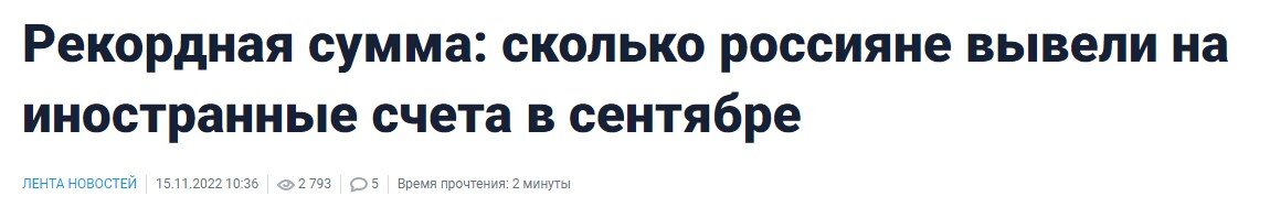 Сентябрь выдался богатым не только на большие объемы снятия наличности из банков, но и на огромную сумму вывода средств за рубеж. Не просто крупную, а рекордную за весь период, с которого Центробанк ведет подобную статистику. Только за сентябрь россияне перевели на счета в зарубежных банках 6,7 млрд долларов. С учетом того, что на начало 2022 года на счетах россиян в зарубежных банках официально числилось около 30 млрд долларов, это колоссальные объемы. Сейчас, к слову, сумма средств россиян на счетах в зарубежных банках удвоилась и составляет уже 63,1 млрд. Также если объемы выведенной из банков наличности в сентябре оказались значительно меньше февральских (когда тоже по понятным причинам наблюдался сильный скачок), то с переводами за рубеж - наоборот: сумма сентябрьских переводов в 1,6 раз превысила февральский уровень (4,3 млрд долларов). Весной переводы за границу были сильно ограничены, а когда ограничения стали снимать, суммы вывода средств за рубеж стали расти. Так, все летние