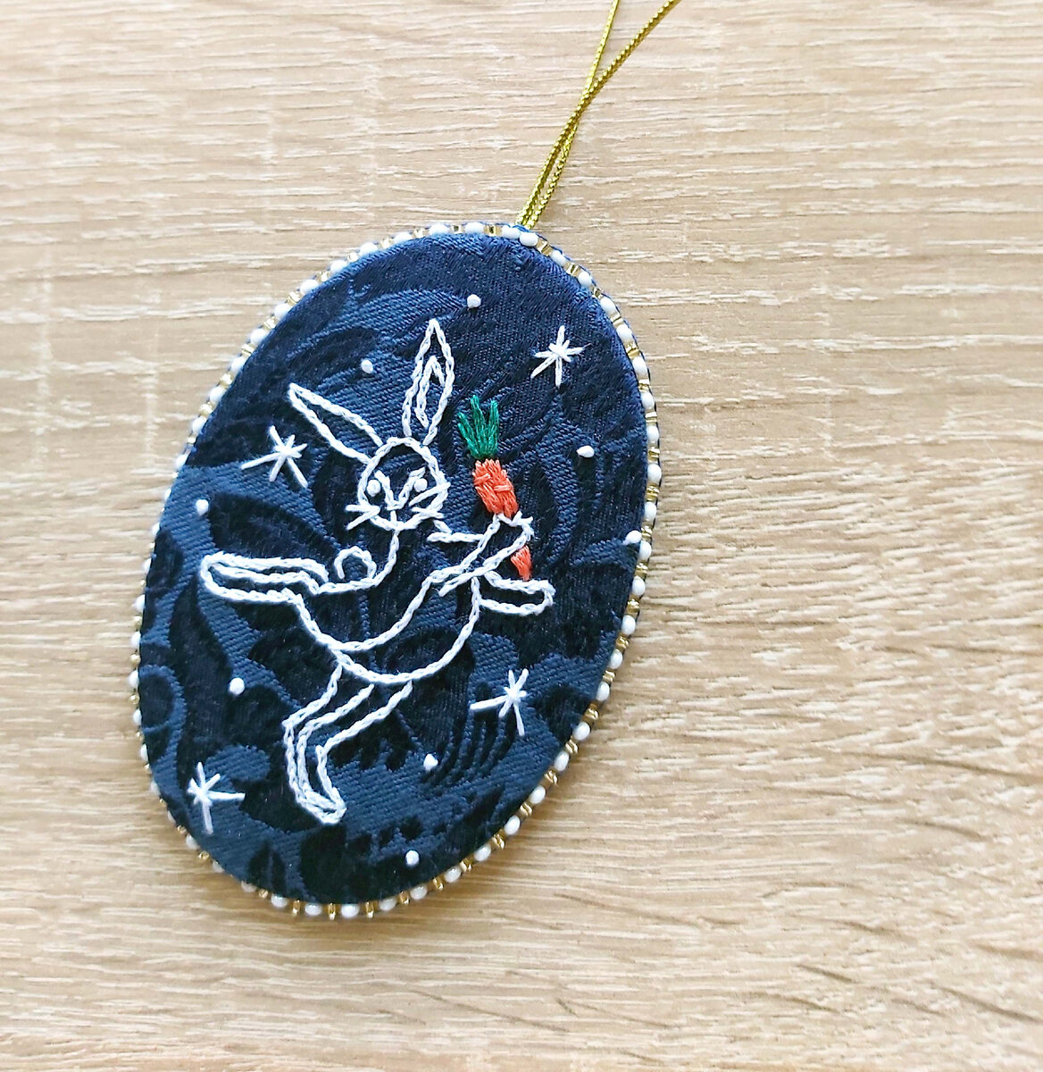 Для работы вам понадобится: - небольшой кусок ткани - кусок водорастворимого флизелина - мулине белого, зеленого и оранжевого цвета - шнурок золотого цвета - бисер золотого и белого цвета - две иглы: для вышивания и пришивания бисера - швейные нитки - кусок картона Схема для перевода на ткань Размер вышивки по овалу: 6,0 х 9,5 см Вышивка выполняется мулине в 2 нитки. Описание работы Вышивка: - переведите схему на ткань, я переводила на водорастворимый флизелин - вышейте контуры кролика швом "в раскол" и прямыми стежками, глаза вышейте французскими узелками в 2 навива - вышейте морковку простой гладью мулине оранжевого цвета и ботву прямыми стежками мулине зеленого цвета - вышейте снежинки прямыми стежками и французскими узелками в 2 навива мулине белого цвета Сборка: - вырежьте из ткани овалы и натяните их на овалы из картона, не забудьте пришить петлю подвеса - соедините две стороны игрушки закрытым бисерным швом. Посмотрите короткий видео-ролик, в котором показана сборка игрушки Ду
