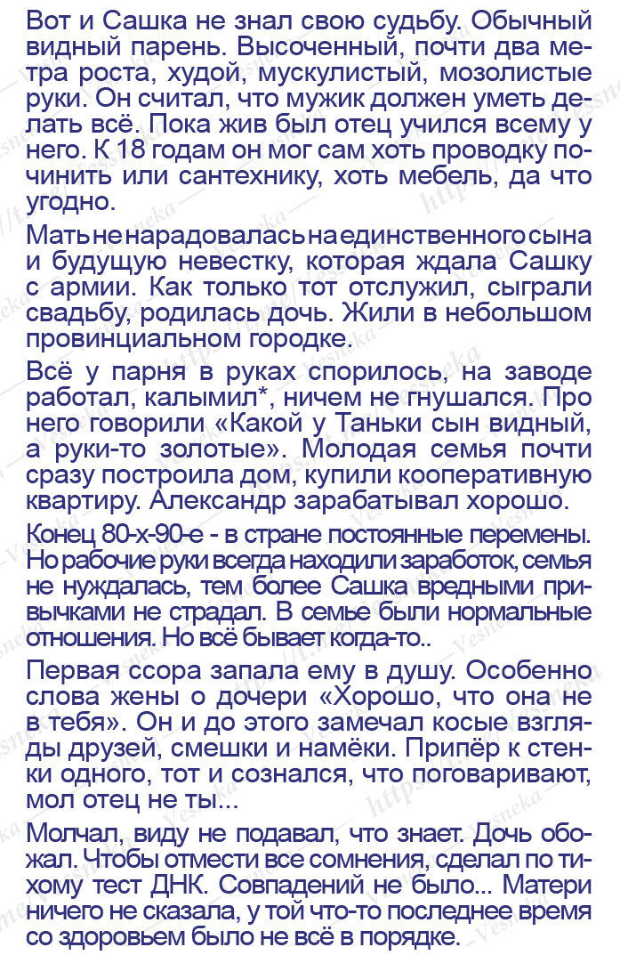Приветный привет всем! Если бы каждый из нас знал как сложится его судьба, жить было бы просто. Не суждено угадать будет этот путь счастливыми и безоблачным или тернистым и сложным. ПыСы. Спросите откуда у меня такая история? Узнала я её случайно. Странность мужчины бросается в глаза внешне, а при общении и того подавно. Столкнулась я с ним, будучи у соседки в гостях. Она потом