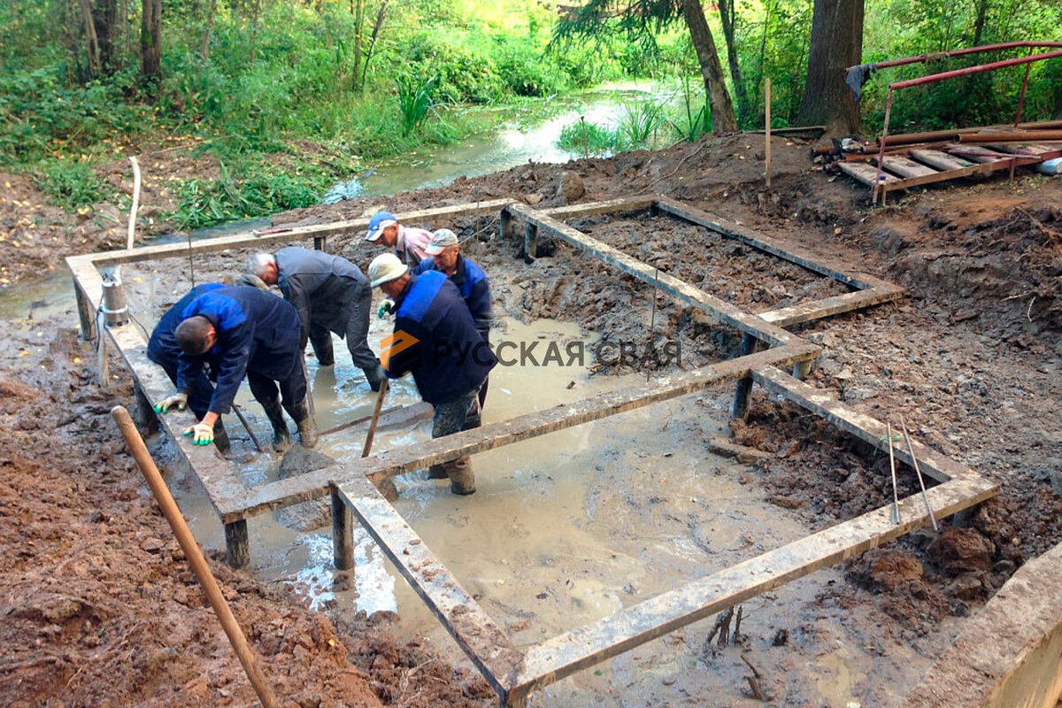 Такая вода несет в себе частички почвы, глины и иных примесей. Заливать бетон в такой «бассейн» нельзя. Уже при заливке, смесь может потерять часть своих несущих способностей, так как нем появится много примесей. Плюс бетону необходимо сохнуть около месяца — в окружении воды он попросту потеряет свои несущие способности.
