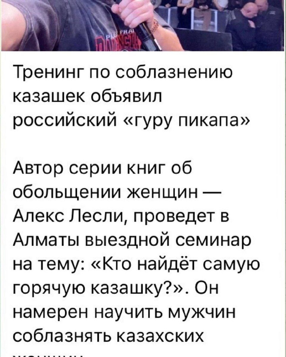 Департамент полиции Алматы заявил, что принятыми мерами гражданину РФ Кириллову А. на год запрещен въезд в Казахстан. Напомним, ранее тренинг по соблазнению казашек объявил российский «гуру пикапа». Автор серии книг об обольщении женщин — Алекс Лесли, планировал провести в Алматы выездной семинар на тему: «Кто найдёт самую горячую казашку?» Российский пикапер Александр Кириллов, более известный как Алекс Лесли, опубликовал в соцсетях анонс своего тренинга по соблазнению в Казахстане. По его словам, он решил объявить собственную мобилизацию «на казашек». В соцсетях такое приглашение казахстанцы встретили, мягко говоря, негостеприимно.