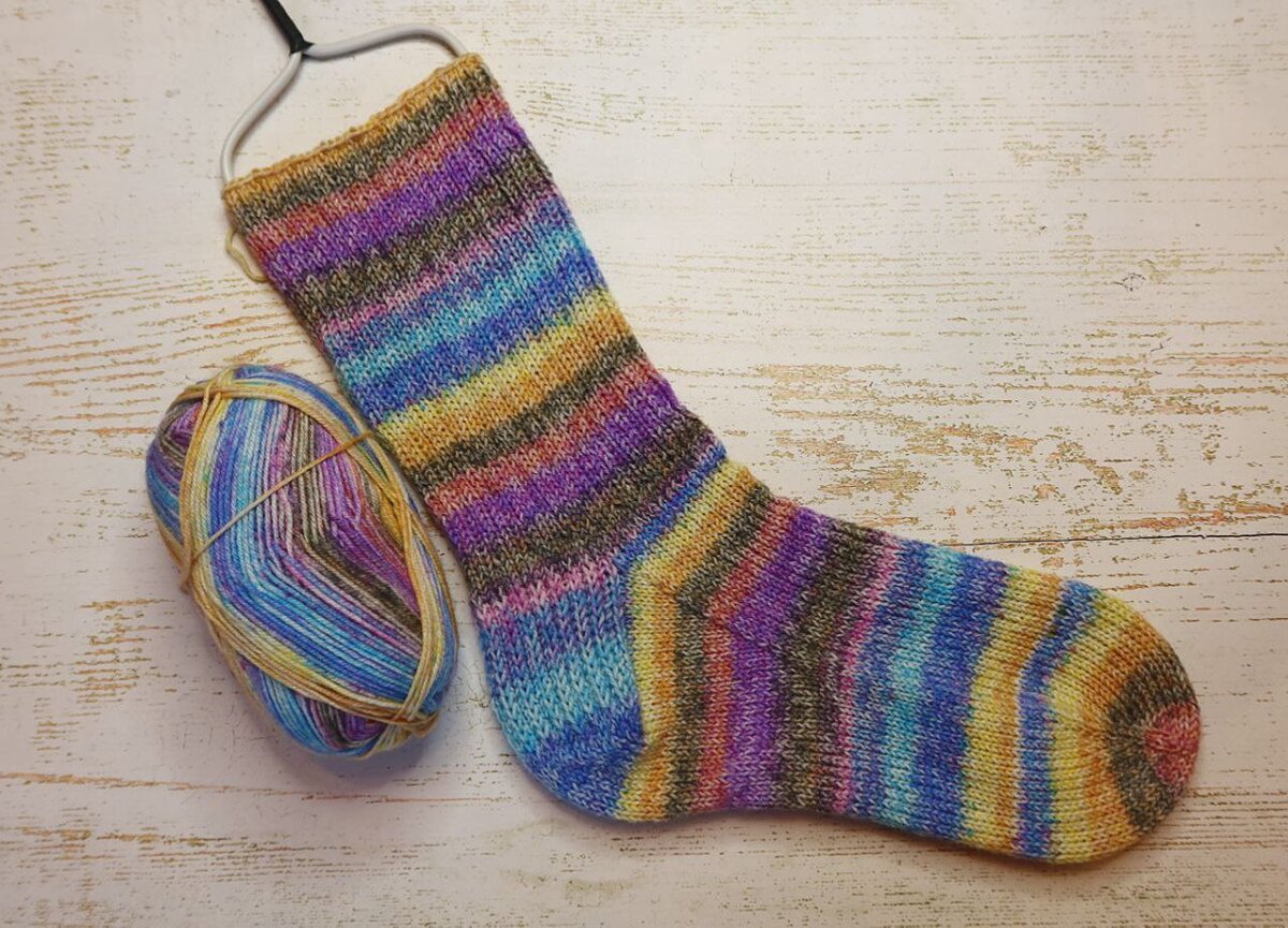 Первый носок я довязала, второй пока не начала. Паголенок довольно высокий и широкий (+8 петель к подошве), чтобы носить носки дома элегантно приспущенными:)