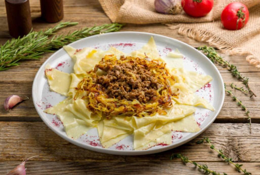 Ингредиенты: Баранина - 750 г Лук репчатый - 1 шт. Перец черный горошком - 5 шт. Соль - по вкусу Для теста: Мука - 400 г Яйцо куриное - 1 шт. Соль - 2 щепотки Вода - 200 мл Для соуса: Томатный соус - 200 мл Зелень рубленая - 1 пучок Чеснок - 1 шт. Перец свежемолотый (смесь) - по вкусу Поставьте на огонь кастрюлю с холодной водой, поместите в нее мясо. Когда вода закипит, добавьте соль, перец горошком и лук. Варите до готовности мяса. Пену, образовавшуюся при варке мяса, необходимо обязательно снимать. Готовое мясо достаньте, разделите на порционные куски, бульон процедите. Далее займемся тестом. В емкости для замешивания взбейте яйцо, добавьте пару щепоток соли, влейте 200 мл теплой воды, перемешайте. Затем постепенно добавляйте муку. Муки может уйти чуть больше или меньше, чем указано в рецепте. Готовое тесто должно быть достаточно упругим, но эластичным. Соберите его в шар, накройте полотенцем и дайте отдохнуть 20 минут. Перед тем, как начнете с ним работать, еще раз вымешайте. Вылож
