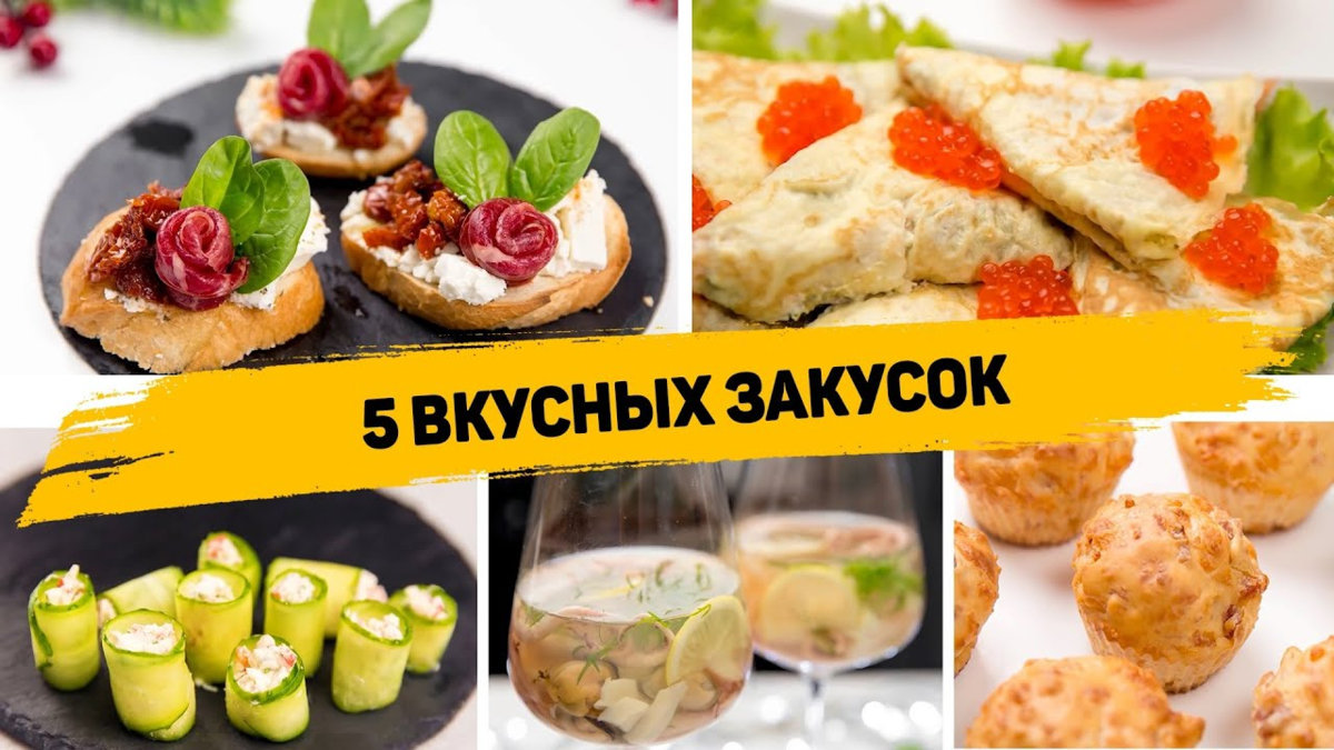 ✳️ БРУСКЕТТА С ВЯЛЕНЫМИ ТОМАТАМИ Ингредиенты: - Хлеб - Сыр фета - Оливковое масло - Вяленые томаты - Мясная нарезка - Зелень Хлеб нарезаем и подсушиваем в тостере или на сковороде. Выкладываем на хлеб сыр. Половину сыра разминаем вилкой, сбрызгиваем маслом, посыпаем специями. Вяленые томаты нарезаем небольшими кусочками и выкладываем на ту часть, которую разминали вилкой. Украшаем розочками из мясной нарезки и зеленью. ✳️ РУЛЕТИКИ ИЗ ОГУРЦОВ Ингредиенты: - 1-2 свежих огурца - Небольшой пучок свежей зелени - Половина болгарского перца - 100-150гр творожного сыра Огурцы нарезать тонкими слайсами (проще всего это сделать при помощи овощечистки). Выложить слайсы на бумажные салфетки, чтобы они впитали лишнюю влагу. Для начинки в отдельной миске смешать мелко нарезанный болгарский перец, творожный сыр и зелень. Посолить. Выложить немного начинки на полоску из огурца и свернуть в рулет. ✳️ БЛИНЧИКИ С РЫБОЙ И ИКРОЙ Ингредиенты: - 3 яйца - Творожный сыр - Соус пес