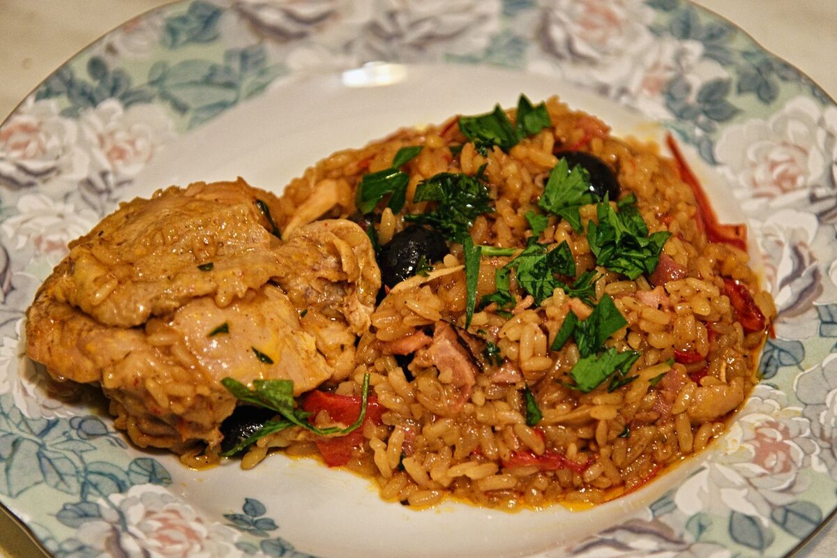 Для приготовления этого блюда Вам понадобятся следующие ингредиенты: Курицу помойте и разделайте на желаемое количество частей. Сложите куски куриного мяса в отдельную емкость, посолите, поперчите и посыпьте мукой, после чего хорошо перемешайте. Лук и чеснок почистите. Лук нарежьте тонкими полукольцами, чеснок мелко нарубите. Перец помойте и почистите и нарежьте узкими полосками. Оливки разрежьте пополам. Петрушку помойте, оборвите листочки и мелко их нарубите. Ветчину нарежьте узкими ленточками В сковороде разогрейте оливковое масло и хорошо обжарьте курицу со всех сторон (20 минут). Переложите курицу в отдельную глубокую посуду. Добавьте в сковороду немного масла и обжарьте в нем репчатый лук и сладкий перец (10 минут). Добавьте после этого чеснок и все хорошо перемешайте. Добавьте в сковороду рис (сухой), перемешайте и готовьте 5 минут. После этого добавьте в сковороду томатную пасту, соль и перец, тимьян и перец чили. Перемешайте и готовьте 3 минуты. Влейте 1 стакан бульона, хорошо
