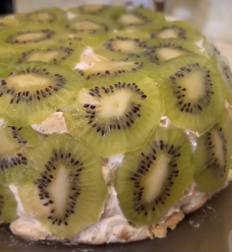 Торт получается нежный, вкусный и очень нравится и детям и взрослым. В миску выкладываем крекер рыбки одну пачку, сахар 180 грамм, сметану 500 грамм. Все хорошо перемешиваем. Добавляем два банана порезанных тонкими колечками и опять хорошо перемешиваем. Три штуки киви очищаем от кожуры и режем колечками, это нам понадобится для украшения торта. Берём глубокий салатник на внутреннюю его часть укладываем пищевую пленку или обычный пакетик. На дно и по бокам салатника укладываем киви и выкладываем основу торта. Закрываем плёнкой и отправляем на ночь в холодильник. Утром убираем пленку и переворачиваем торт на блюдо. Чем больше он стоит, тем он становится нежнее и сочнее. Приятного чаепития!
