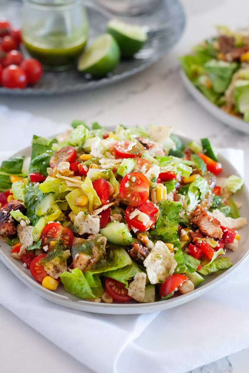 Соединяем ингредиенты для салата: Смешайте листья салата, красный перец, огурец, помидоры и зеленый лук в большой миске. Отложите. Обуглить кукурузу: Нагрейте 1 чайную ложку оливкового масла в средней или большой сковороде с толстым дном на сильном огне. Когда масло нагреется, добавьте кукурузу. Приправьте кукурузу 1/4 чайной ложки соли и готовьте, периодически помешивая, пока она не почернеет местами и не станет мягкой, около 3 минут. Переложить на тарелку. Приправить курицу: Посыпьте приправой для тако и 1/2 чайной ложки соли поверхность курицы, втирая ее и покрывая, чтобы курица была полностью приправлена. Приготовить курицу: В ту же сковороду, в которой готовили кукурузу, добавьте 1 столовую ложку оливкового масла и поставьте на средний огонь. Когда масло нагреется, добавьте курицу и готовьте, пока нижняя часть не подрумянится, а мякоть не станет непрозрачной примерно наполовину по бокам, от 4 до 5 минут. Переверните курицу и продолжайте готовить, пока вторая сторона не подрумянитс