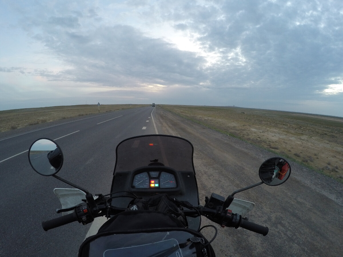 Выехал из Аральска. На заправке сфотографировались с итальянцами. Они поехали на Байконур а я домой. С утра стало холодно. Одел дождевик, но даже его продувал холодный боковой ветер. Ветер постоянно сдувал на встречную полосу. Благо машин было мало. Качество дороги ухудшилось. Ехал под углом 10-15 градусов километров 600. Устал. После Карабутака дорога свернула и стало ехать на много приятнее. Остановился сфотографироваться в Хромотау и поменять деньги.