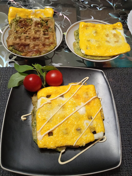 Недавно приезжали к нам мои внученьки, приободрить нас с мужем и поднять настроение...радость наша! Утром старшая предложила сделать яичницу «по-новому», им учительница на трудах (сейчас - технология) всякие новинки предлагает с кухонными гаджетами делать. «Ну, давай, бабуль, попробуем с тобой!» Достали электровафельницу, яйца из холодильника. Взяли руколы и шпината для нового рецепта, и приступили строго по её записям в тетрадке. Нарезали большой пучок шпината и руколы в миску, добавили 2-3 ст. ложки йогурта, пробили погружным блендером, добавили 1 яйцо, 3 ст. ложки муки (у меня из ц/з зелёной гречки) и 1/2 ч ложки разрыхлителя, добавили тёртый сыр моцарелла. Все хорошо перемешали, посолили, поперчили и выложили на горячие панели электровафельницы. Пекли 5-6 минут. Испекли 4 штуки, а затем приступили к яйцам. Отделили в каждом яйце белок от желтка, и стали выливать на горячую панель белок, а следом на него – желток. Закрыли крышку, а через три минуты сняли и положили на вафлю из муки