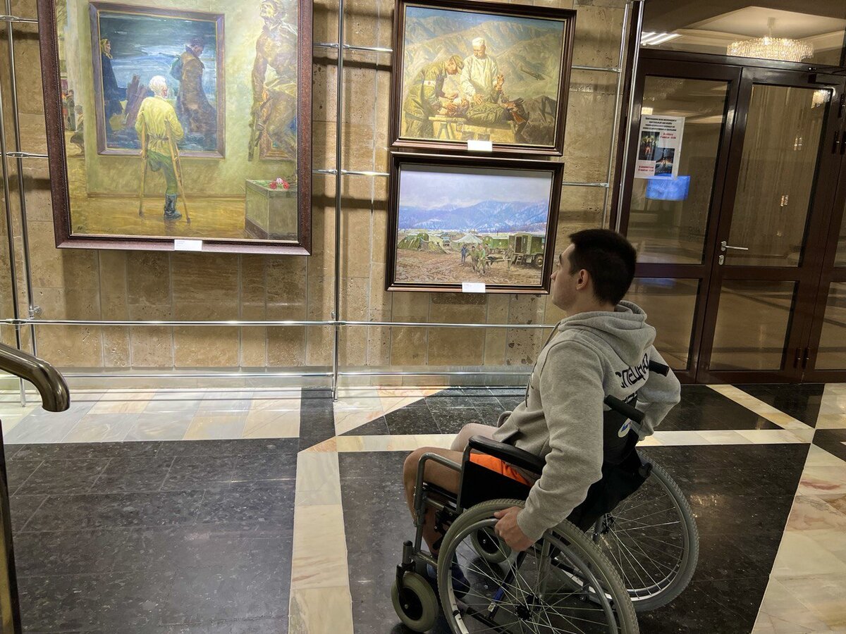 Посетители новой выставки работ военных художников студии имени М.Б. Грекова узнают в картинах себя, свои истории или истории знакомых. В выставочном пространстве НМИЦ ВМТ имени А.А. Вишневского для пациентов, проходящих лечение в госпитале, и сотрудников расположилась новая галерея портретов, военных баталий, мирных пейзажей. Здесь представлены работы современных авторов и тех, кто был у истоков знаменитой студии. – Знаете, какая работа мне понравилась больше всего? Вот этот портрет!, – ведёт меня через всю выставку Вячеслав из отдела пожарного надзора и останавливается у работы А.Г. Ваганова «Спасибо, доктор!», – Смотрите, как эта девушка похожа на нашу медсестру с пятого этажа. Даже не знаю, как такое возможно, – эмоционально рассуждает посетитель выставки и ты невольно вовлекаешься в рефлексию и ищешь сходство с оригиналом. Привлекла внимание и одинокая фигура бойца в инвалидной коляске, рассматривающего работу В. К. Дмитриевского «За родную землю». На картине в декорациях художест