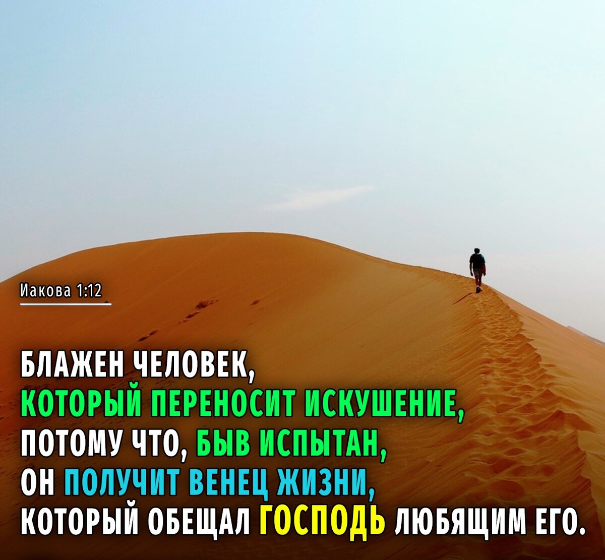 “Блажен человек, который переносит искушение, потому что, будучи испытан, он получит венец жизни, который обещал Господь любящим Его. В искушении никто не говори: «Бог меня искушает»; потому что Бог не искушается злом и Сам не искушает никого, но каждый искушается, увлекаясь и обольщаясь собственной похотью; похоть же, зачав, рождает грех, а сделанный грех рождает смерть” (Иак. 1:12-15).