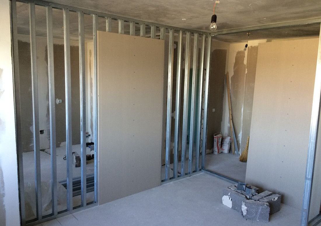 Обшивка стен гипсокартоном – простой и бюджетный способ выравнивания поверхностей. Есть 2 способа выполнения этой работы: бескаркасный и каркасный способ с использованием профиля. Бескаркасный монтаж обойдется дешевле, поскольку обшивочный материал крепят прямо на требующую выравнивания поверхность, фиксируя на клей, возведение дополнительной обрешетки не требуется. Крепление гипсокартона к стене таким способом возможно, только если высота потолков не превышает 3 м и стены не имеют значительной кривизны. Каркасный способ подходит, когда нужно возвести стены и перегородки и проложить под обшивкой утеплитель или коммуникации. В этом случае на стену предварительно ставят обрешетку, и только потом закрепляют ГКЛ. Первый этап – подготовка. В новостройке необходимо хорошо прогрунтовать поверхности с помощью грунтовки глубокого проникновения. Во вторичном жилье стены должны быть очищены от старых обоев, краски грязи и пыли, затем необходимо хорошо прогрунтовать поверхности с помощью грунтовк