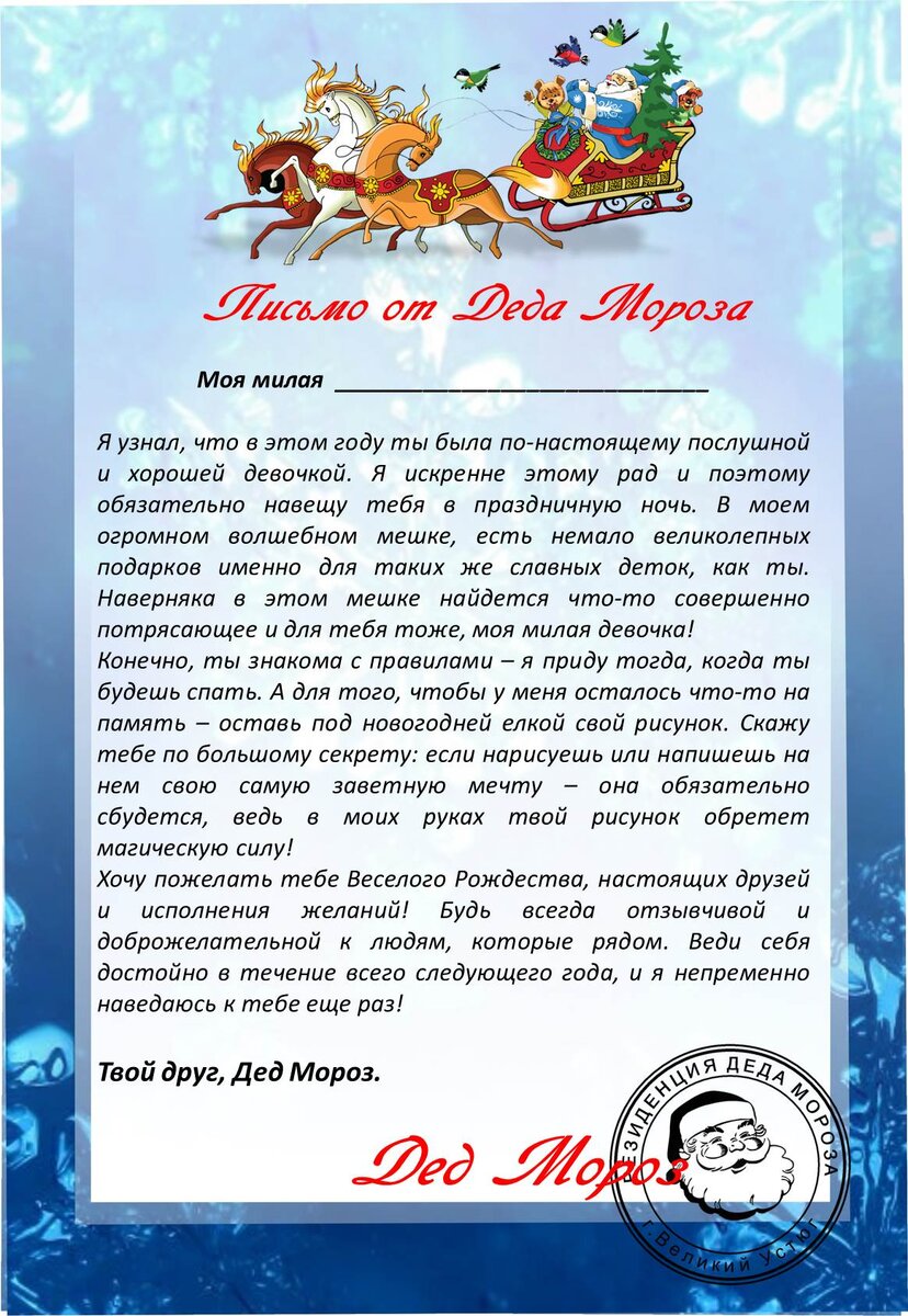 В архиве 4 шаблона: письмо мальчику, девочке, 2 пустых шаблона. СКАЧАТЬ