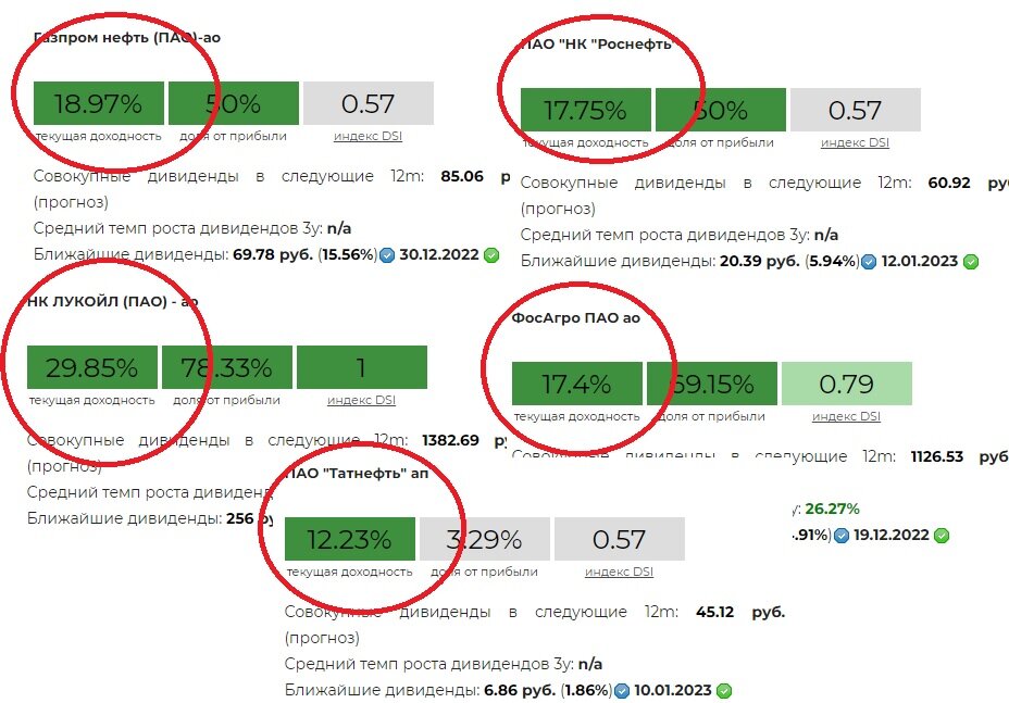 Конец года уже близок и вроде бы "дивидендный сезон" давно закончился, но не смотря на это, еще осталась возможность купить акции российских компаний, для получения хороших дивидендов в этом году! Под конец 2022года активизировались нефтяники и выкатили свои рекомендации от советов директоров по размерам и срокам дивидендов. Как обычно, для того, чтобы принять решение о покупке дивидендных акций-я использую сервис на сайте ДОХОД! Выплаты по дивидендам в совокупном годовом выражении достаточно высокие: Такая текущая дивидендная годовая доходность акций данных компаний, согласитесь, неплохо! Если смотреть на конкретные выплаты, одобренные советами директоров в декабре, то данные такие: Выделил интересные лично мне компании, акции которых я собираюсь купить в ближайшее время до закрытия реестра.